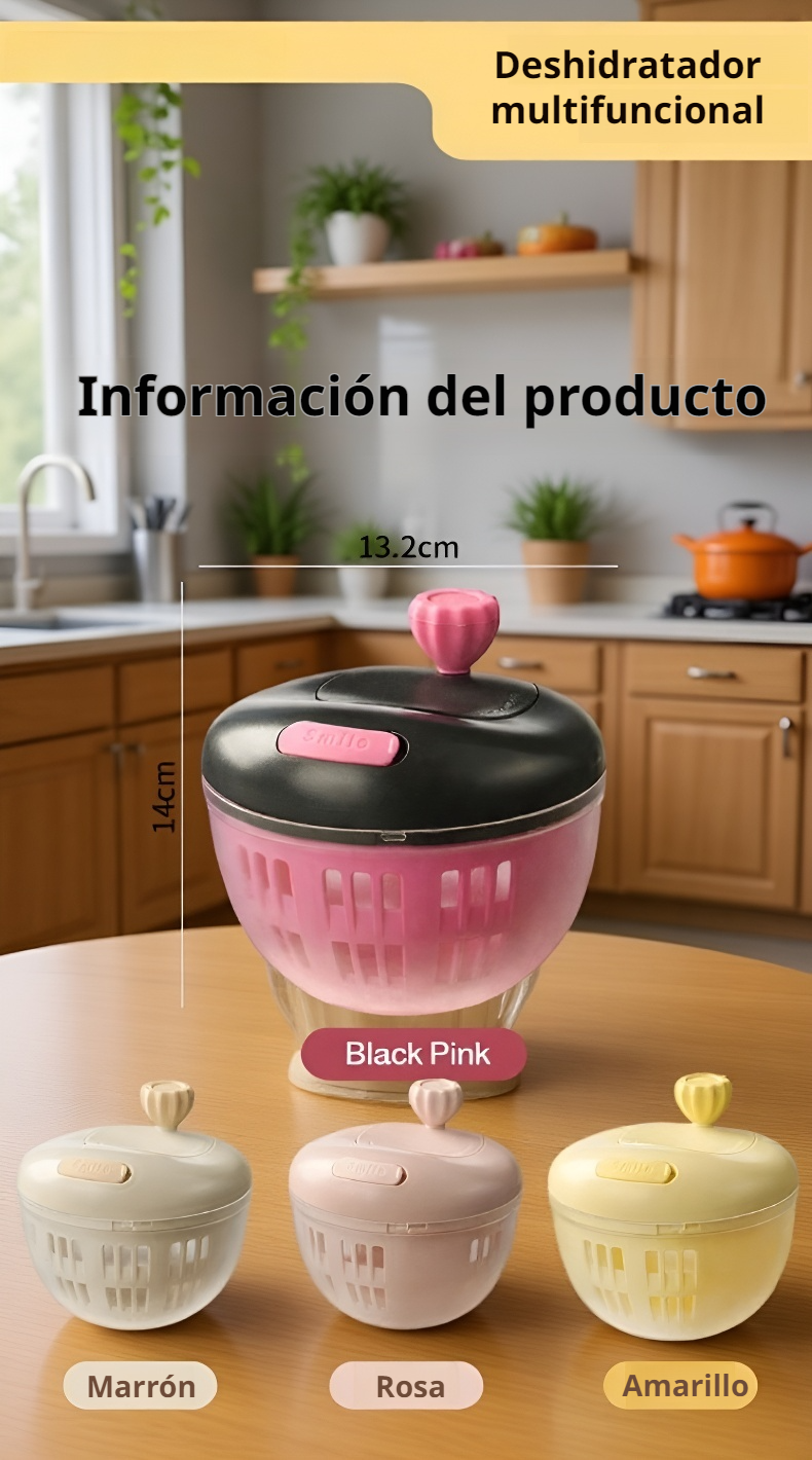 ● Diseño ergonómico que facilita el escurrido manual de verduras y frutas, ahorrando tiempo y esfuerzo en la cocina. ● Fabricado con materiales resistentes y seguros para el contacto con alimentos, garantizando durabilidad y salud para toda la familia. ● Capacidad amplia ideal para preparar grandes cantidades de ingredientes, perfecto para familias y reuniones. ● Fácil de desmontar y limpiar, apto para lavavajillas, lo que asegura una limpieza rápida y sin complicaciones. ● Mantiene las verduras y frutas frescas y crujientes al eliminar el exceso de agua de manera eficiente y uniforme.